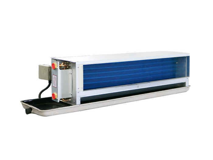 臥式明裝風(fēng)機(jī)盤(pán)管機(jī)組主要由風(fēng)機(jī)、換熱器(盤(pán)管)、殼體、托盤(pán)和控制器構(gòu)成。